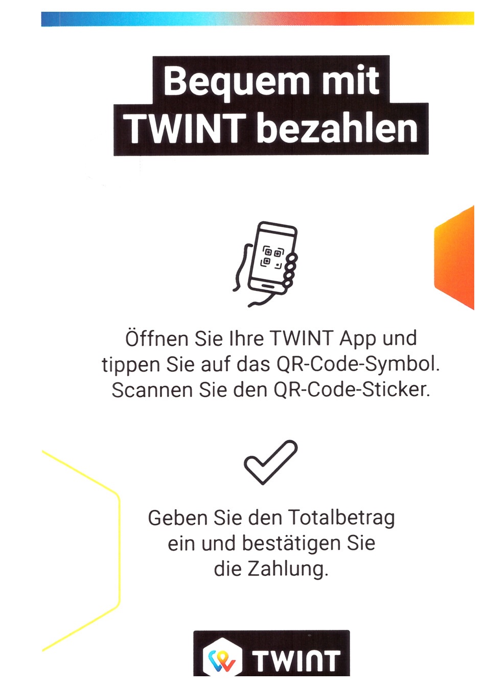 Bitte benutzen sie diese online Version von Twint nicht für die Zahlung von Fahrzeugen. Die Gebühren dafür sind wesentlich höher als vor Ort am Terminal.